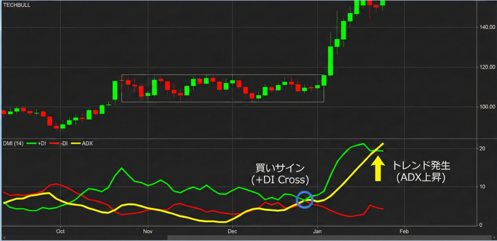 ポイント: +DIと-DIで「方向」を、ADXで「勢い」を見るのが基本です。