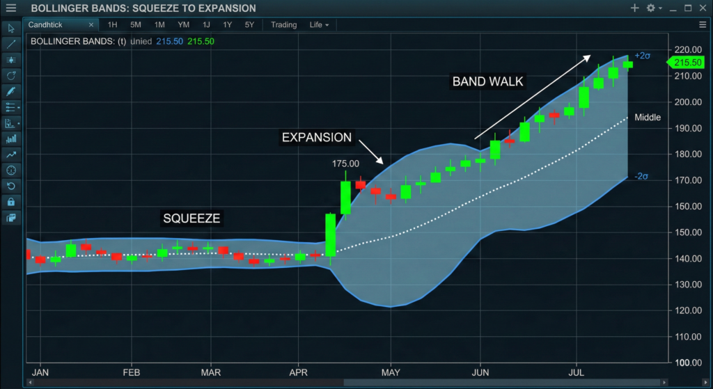 - スクイーズ(Squeeze):バンドの幅が収縮している状態。エネルギーを溜め込んでおり、次なる大相場の前兆です。