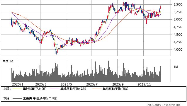 2025年に入り、半導体市場の調整局面で株価は一進一退を繰り返していましたが、直近の決算では通期見通しの上方修正を発表。底堅さを見せています。