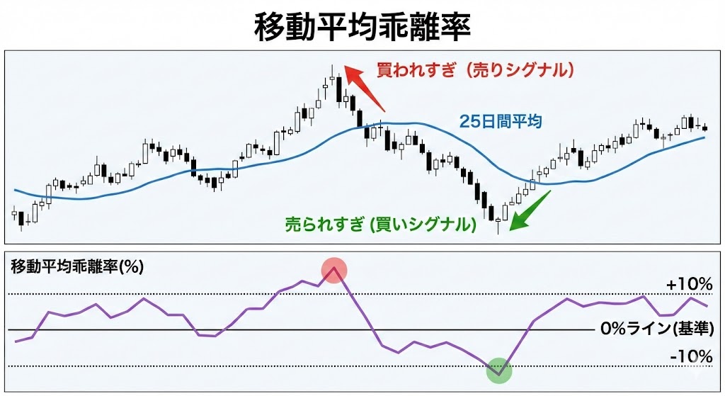 - 定義: 現在の株価が、移動平均線から「どれくらい離れているか」をパーセンテージ(%)で表した指標。