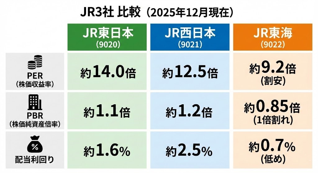 投資判断において重要なのは「他と比べてどうか」です。上場しているJR本州3社(東日本・西日本・東海)を、2025年12月時点の主要指標で比較してみました。