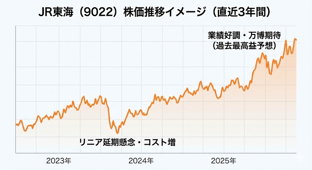 業績が良いにもかかわらず、株価は一本調子で上昇しているわけではありません。これは後述する「リニア建設リスク」などが頭を押さえているためと考えられますが、逆に言えば「業績に対して株価が過熱していない」とも捉えられます。