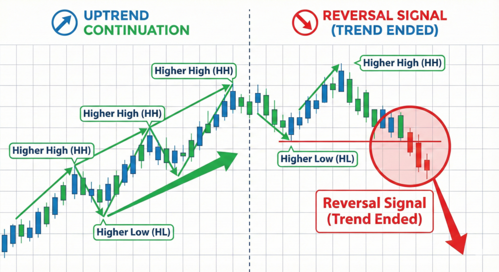 上昇トレンドにおいて、「直近の安値(ラストの押し安値)」を下回った瞬間、上昇トレンドは終了したとみなされます。